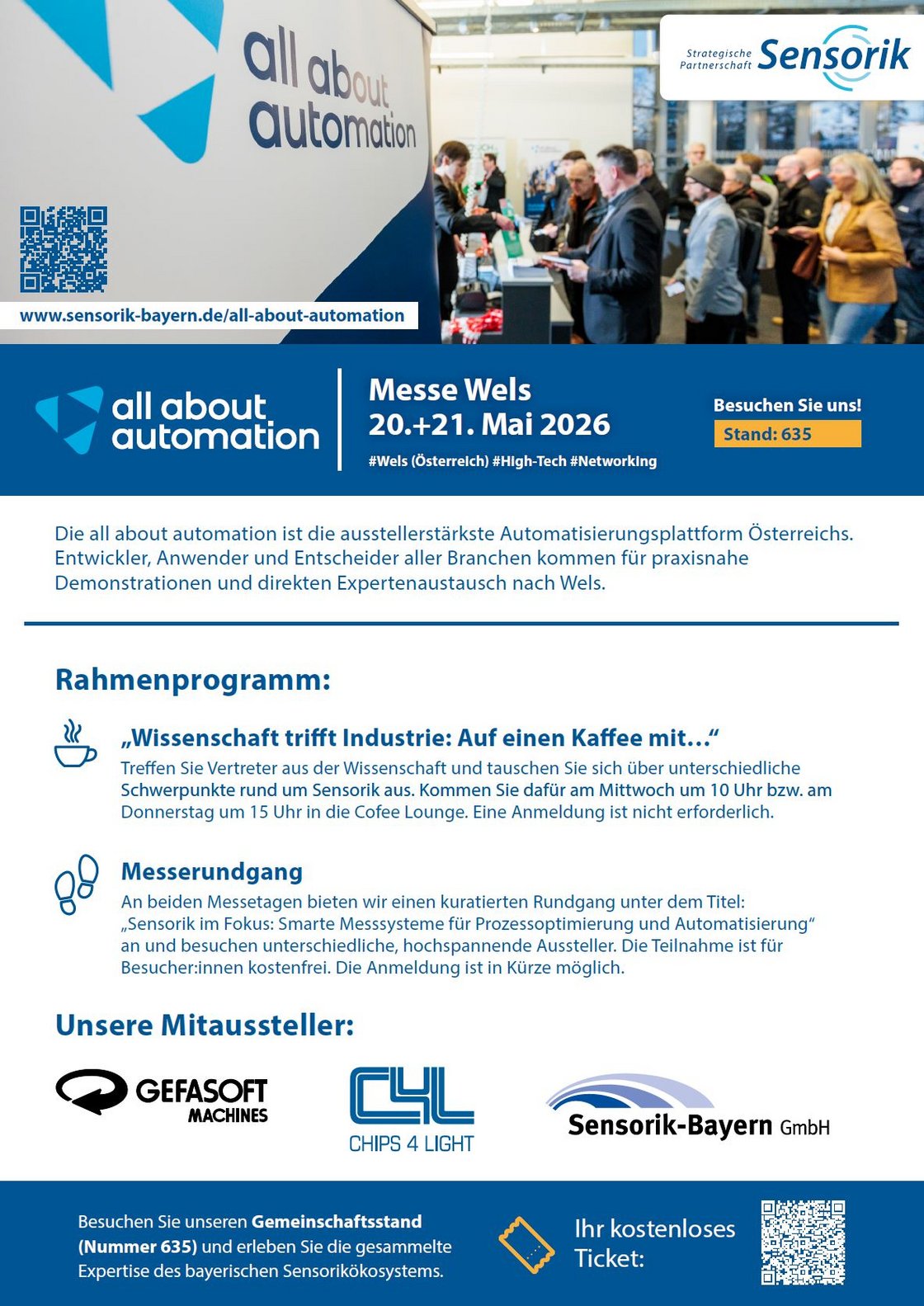 Treffen Sie die bayerische Sensorik-Community am 20. und 21. Mai 2026 in Wels: Wir sind mit Mitgliedern und Partnern auf der all about automation. Details finden Sie hier.